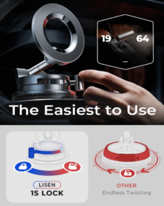 【Strengthened Vacuum Suction Cup with Lever Lock Enhancement】Featuring reinforced vacuum suction and a lever lock mechanism, this foldable magsafe car mount delivers the ultimate physical suction power. Unlike sticky mounts, this magnetic car phone holder offers a quick-release design for easy repositioning without leaving any residue. The more it is shaken while driving, the firmer the suction becomes. The ideal magnetic car phone holder.